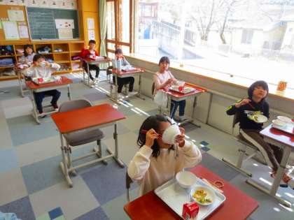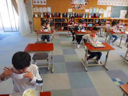 授業中に訪問できなかった4年生は、給食時に撮影しました。