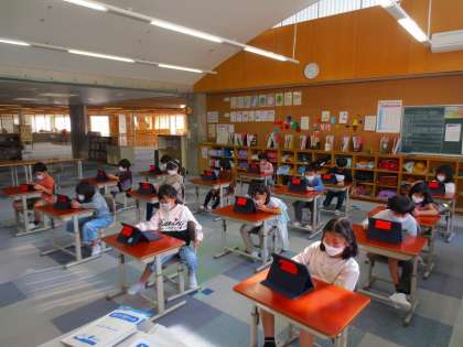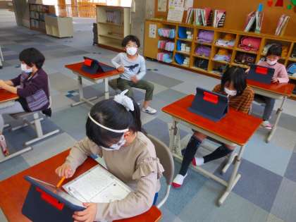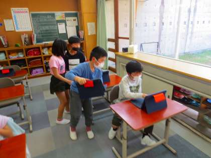 前時と同様に問題の解き方をタブレットに書き込み、共有しています。自分の考えを説明するだけでなく、他人の考えを聞いて最善の導き方を考えるという、ただ正解を求めるだけでない要素があります。