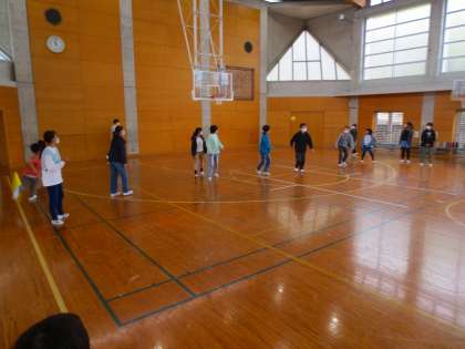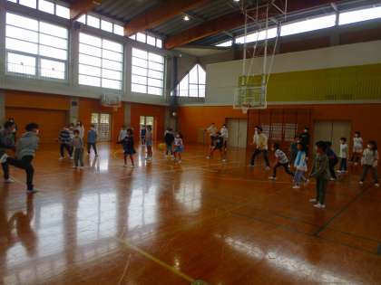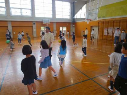 2,3年生が6年生に声をかけ、一緒にドッジボールをしていました。