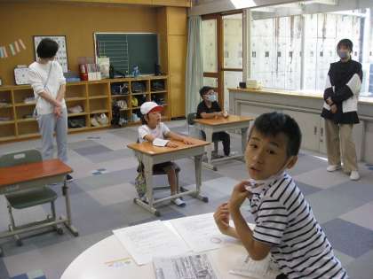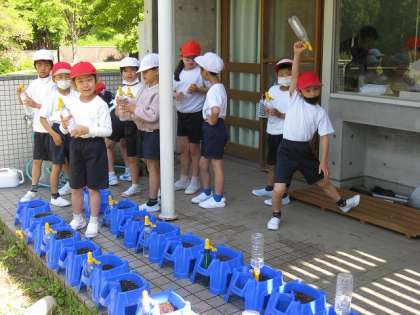 2年生は、ミニトマトの水やりをしました。4粒種をまいて、4つとも芽が出ている子もいました。