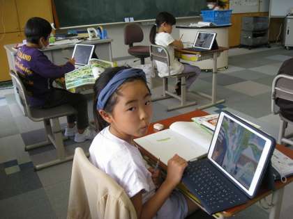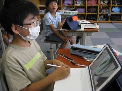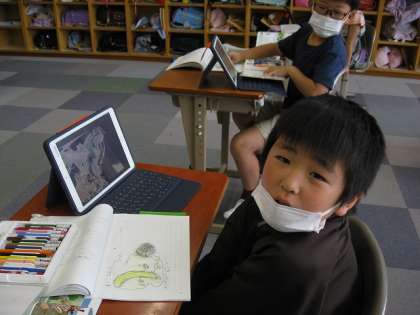 理科で、あおむしの観察です。写真を見てノートに記録していました。