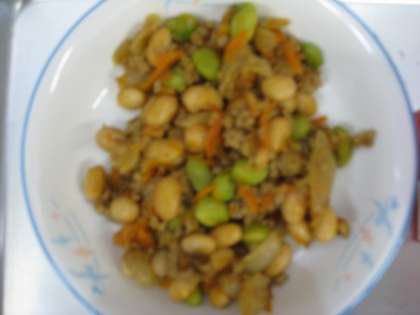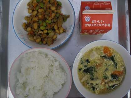 ピリ辛大豆、かきたま汁、でした。先週も同じような給食を食べた気するのですが、給食は栄養を大切にしていますから、「大豆」がよく出されます・・・。