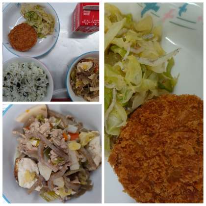 豚肉のすき煮、和風コロッケ、キャベツとしらすのごま和え、ワカメご飯、でした。