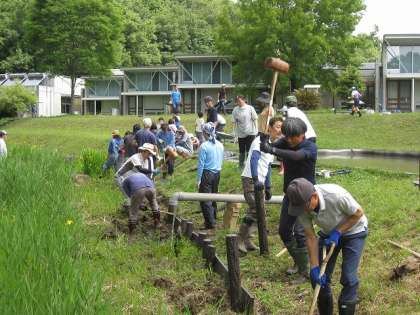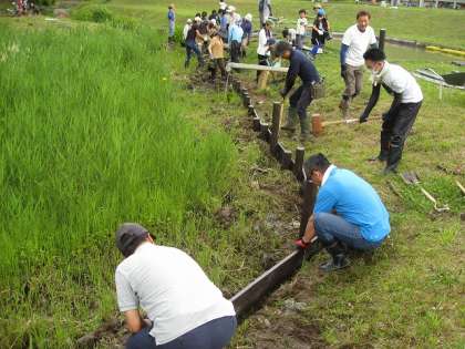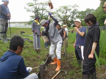 下流は橋の近くから、上流は全体の半分くらいの地点から「くい打ち」「土留め」をしました。