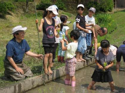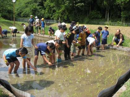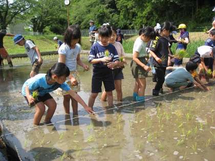ロープに近いところに植えるのが、3年生にはなかなか難しい様子で、何回か植え直しながら田植えしました。