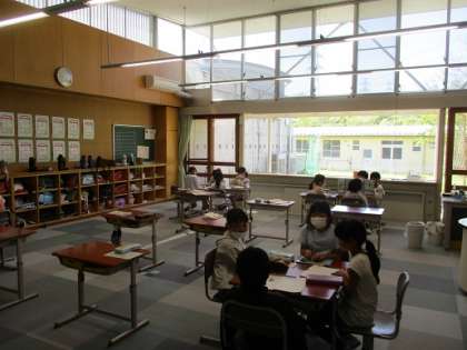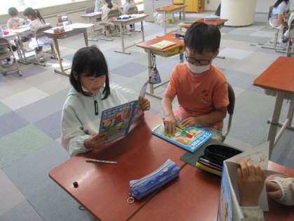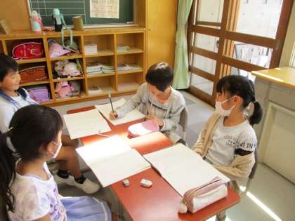 国語で「もっと知りたい、友だちのこと」の授業をしています。相手を見て話したり聞いたりするとともに、言葉の抑揚や強弱、間の取り方などに注意して、自分の好きなことなどをグループで発表しています。みんな上手に話しています。