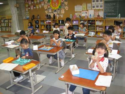 1年生は、図工の「焼き物」の粘土作品を作る前に、油粘土で練習していました。