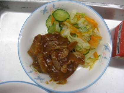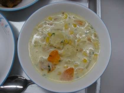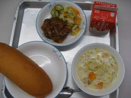 コーンスープ、ハンバーグのデミグラスソースかけハンバーグ、ミルクロールパン、でした。
