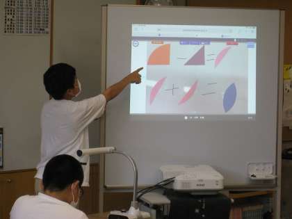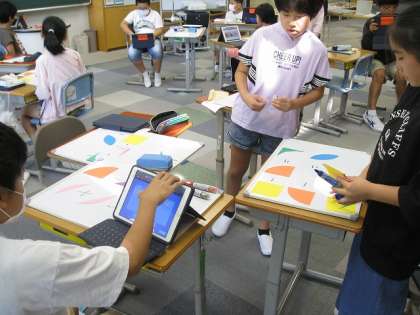 「自分の考え」や「グループの考え」をタブレットを通じて共有し、意見を出し合って考える授業でした。