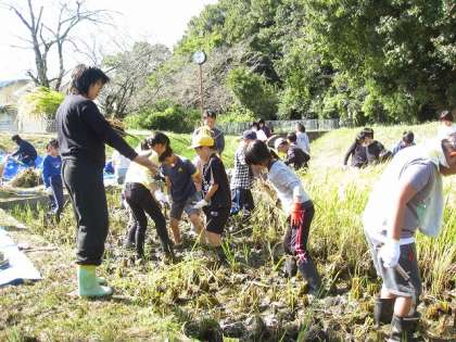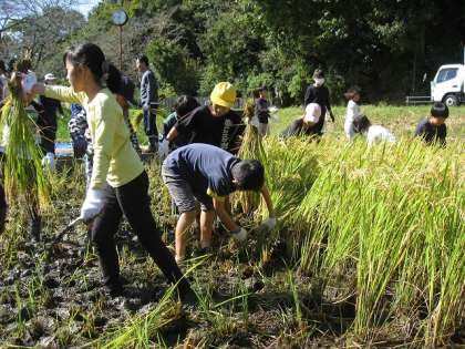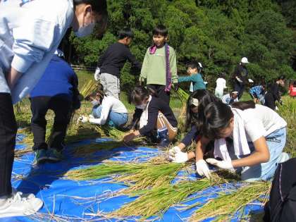 稲を縛るのが難しくて、5年生の女子がヘルプに行きました。