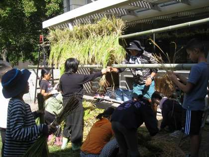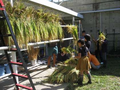 5年生の教室前に「はざかけ」をして乾燥させています。