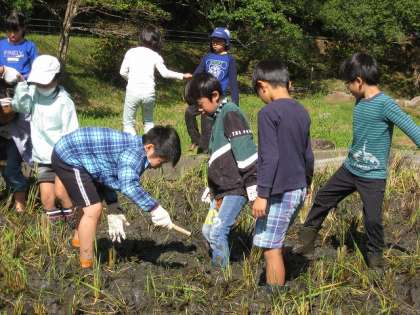 田んぼでは、ぬかるみに長靴がはまる子が続出しました。