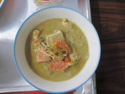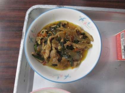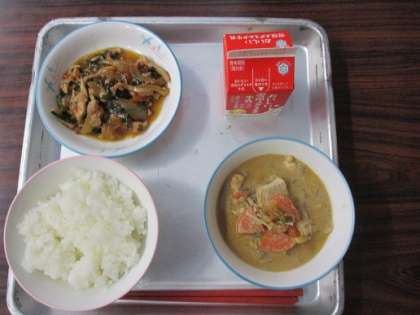 今日のメニューは、豆乳ごまみそスープ、野菜豚丼、ごはん、牛乳です。