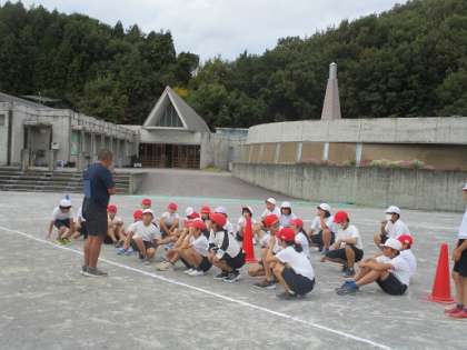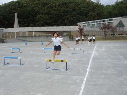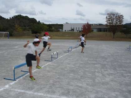 ハードルの授業をしています。どのコースならスムーズに跳べるかを考えながら取り組んでいます。