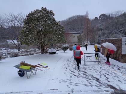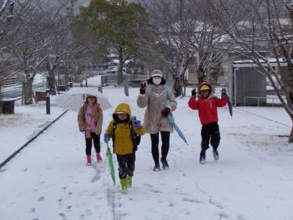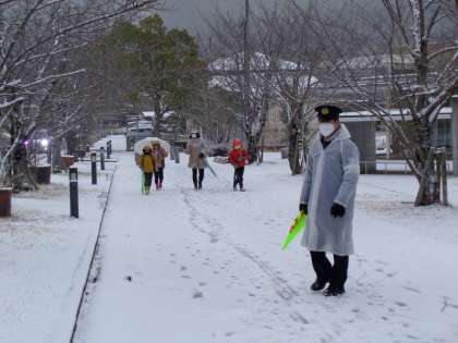 交流センター駐車場へのカーブや橋、大通りから路地に入る横断歩道を除雪、融雪剤をまきました。近所の保護者の方が手伝いに出てくださり大変助かりました。