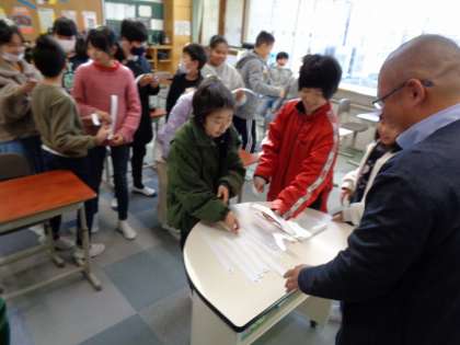 今日は、席替えの日でした。白い紙を使ってくじ引きで決めているようでした。