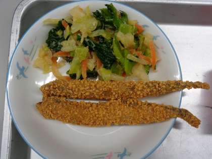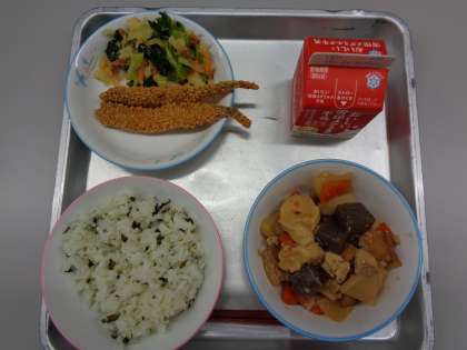 わかめごはん、大根と鶏肉の煮物、子持ちちしゃものカリカリフライ、アレッタのアーモンドあえ、でした。