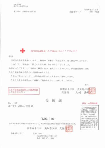 義援金は、瀬戸市社会福祉協議会から日本赤十字社を経由して石川県に設置された義援金配分委員会に届けられることになっています。