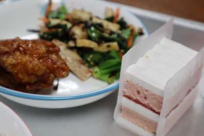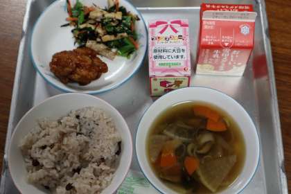 赤飯、のっぺい汁、鶏肉のてりかけ、千草あえ、米粉のガトーショコラ、でした。