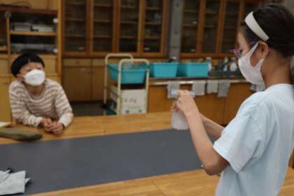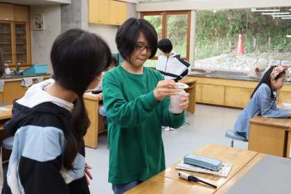 物の燃え方と空気の学習です。集気びんを振って、石灰水が白くにごるのを確認していました。どこからか「カルピスみたい…」という声。ちょうど給食前のおなかがすく時間でした。
