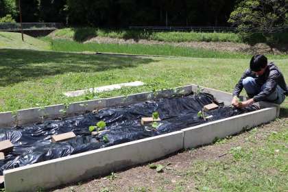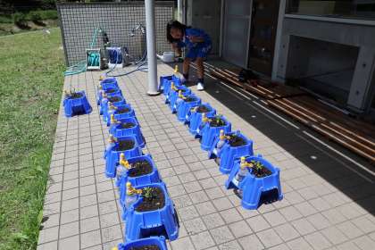 2年生も野菜を植えたところでした。先生が心配そうに見つめていました。