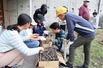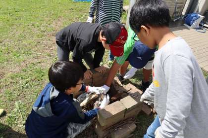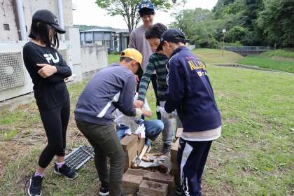 「物が燃えるときの特徴」を話し合いながら確認して、とにかく、自由に薪を並べさせてみました。