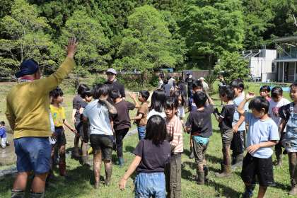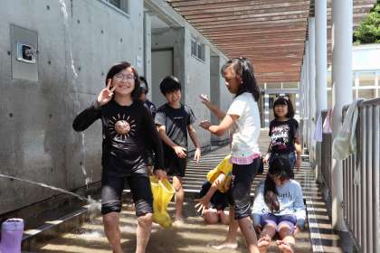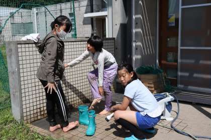 田んぼの色と同化して保護色になってしまった子は、プールの温水シャワーで頭から洗い落としました。