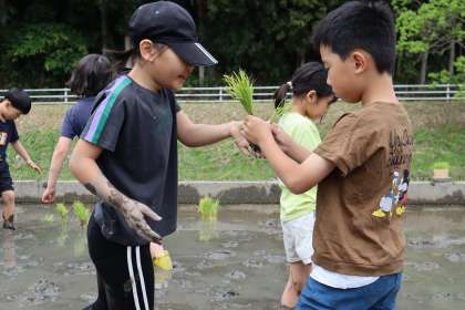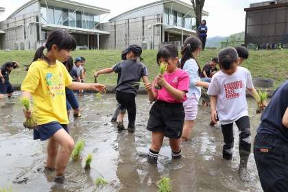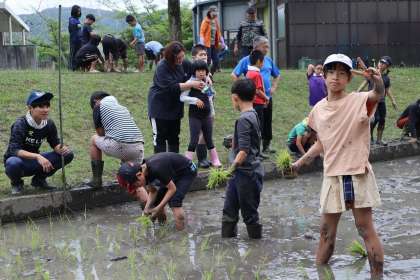 先週の「代掻き」よりは、泥まみれにならずに済んでいますね・・・。