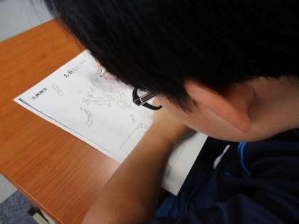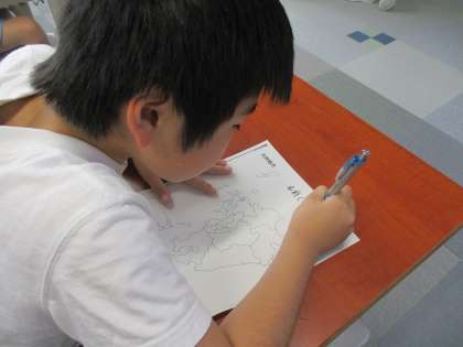 県名を漢字で書く練習をしています。横の長さ、細かい形など、がんばって覚えていました。