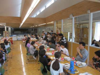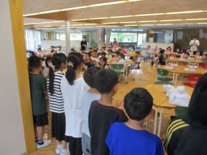 野外活動の「いただきます」の歌を5年生と一緒に歌って、今日のランチ給食が始まりました。今日から、1年生もランチスペースに加わりました。(1年生も一緒に歌いたかったらしいです。)