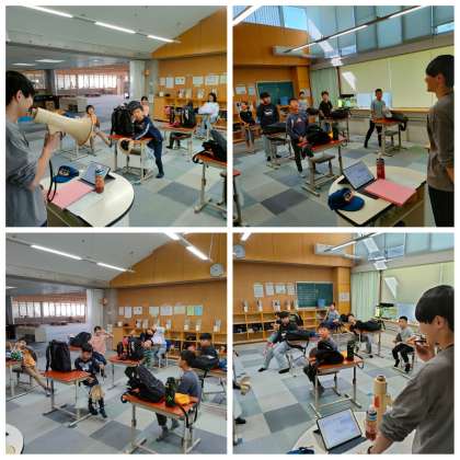 担任の先生は、声が出なくてハンドマイクを使っています。