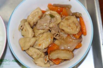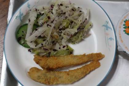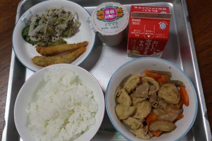 ごはん(あいちのかおり)、瀬戸豚とたまねぎの煮物、メヒカリのフライ、赤ジソ和え、蒲郡ミカンゼリーでした。
