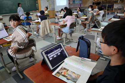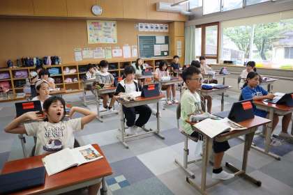「一つの花」を読んで、タブレットも活用して意見交換しています。