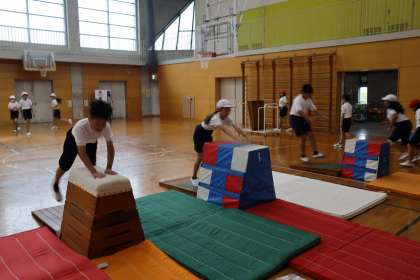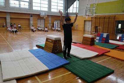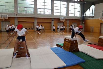 跳び箱をしていました。先生が着地の手本を見せていました。