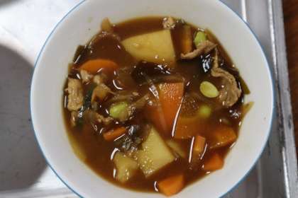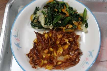 ごはん、具だくさん彩りみそ汁、とうもろこしとほしえびのかき揚げ、ほうれん草のおかか和え、でした。