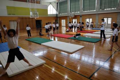 3・4年生は、体育館で体育の授業でした前転や開脚前転に挑戦しました。蒸し暑い中ですが、水分補給をしながら活動しました。