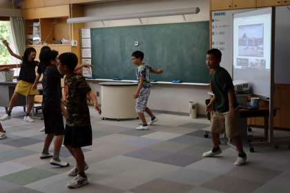 5年生は、ダンス練習です。今日はバスケットゴールの点検があり、体育館が使えなかったので、教室で練習しました。