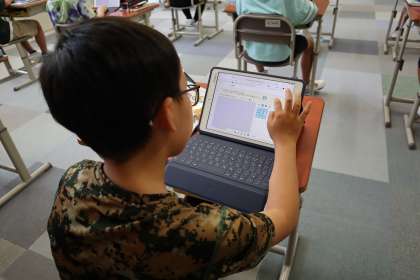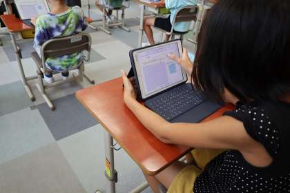 5年生は、算数です。「公倍数」について、担任の先生の自作教材を使って、タブレットで操作をしながら、考えていました。「正方形って…」先生のヒントでたくさん気が付くことができていました。