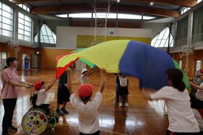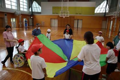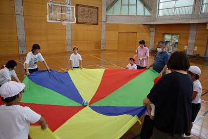 みんなで大きな布を広げて、上下させながら、真ん中のボールを空中に飛ばしていました。