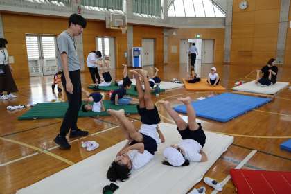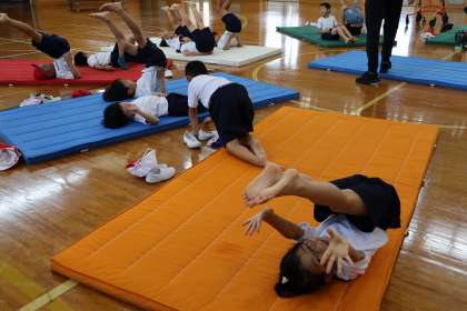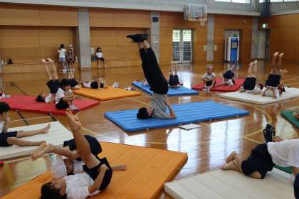 先生が、肩倒立のお手本を見せていました。お気を付けて・・・