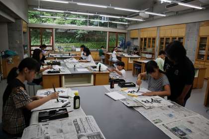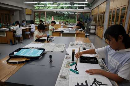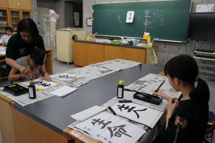 3時間目、暑いので、エアコンが効く家庭科室で習字をしています。