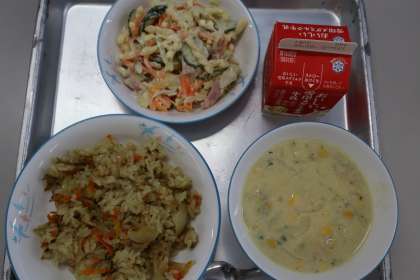 今日の給食は、牛乳、カレーピラフ、豆乳スープ、マカロニとチーズのサラダです。