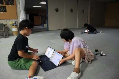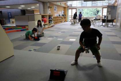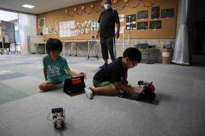 走行ロボットにタブレットで入力して、「前進」「止まれ」などの命令通りに動かしています。