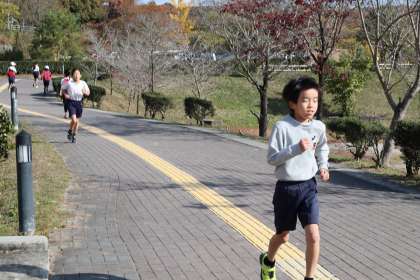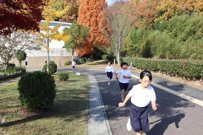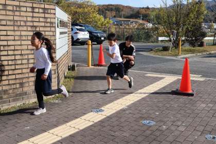 3時間目は、3、4年生が体育でした。交流センター手前の折り返し地点で、大島選手が子ども達にアドバイスを送ってくださいました。
