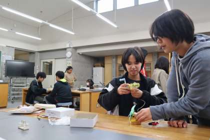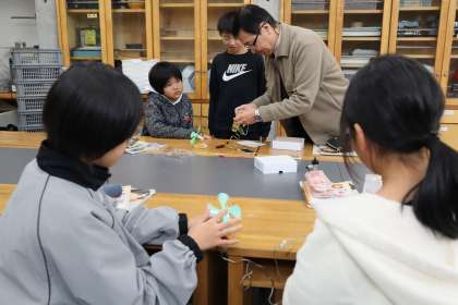 手回し発電機で発電して、プロペラを回したり、豆電球に明かりをつけました。