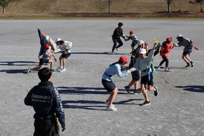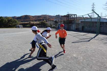 持久走と同時進行で、タグラグビーに取り組んでいます。相手のタグを取る練習から始まりました。みんな元気です。