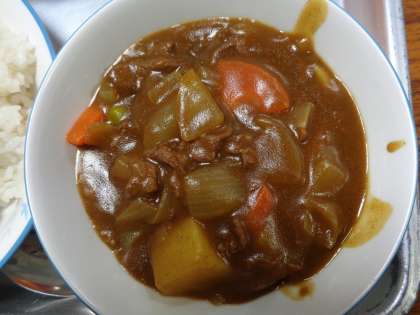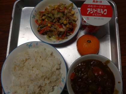 今日のメニューは、麦ごはん、ビーフカレー、いろどりサラダ、みかん、発酵乳です。