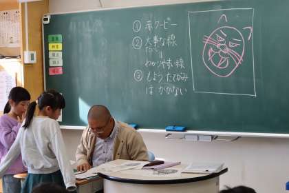版画の下絵を石膏に写す前に、先生と相談して構図を決めています。角度が変わるだけで、作品のイメージが変わっていきます。