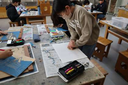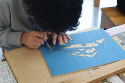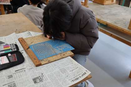 版画の彫りと刷りを行いました。細かく丁寧な作品が並んでいました。
