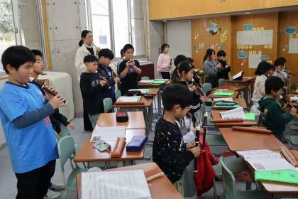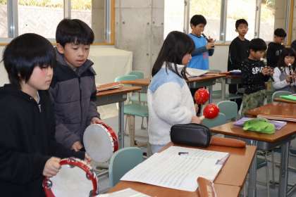 「リズム良く演奏できましたか?」より「楽しく演奏できましたか?」と聞いた時の方が、手を挙げる児童は多かったです。